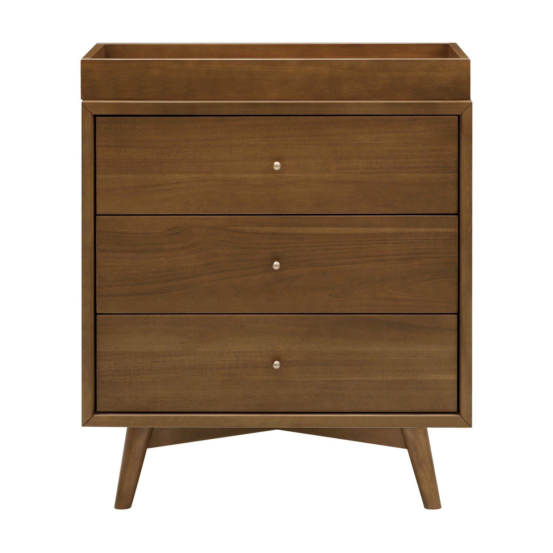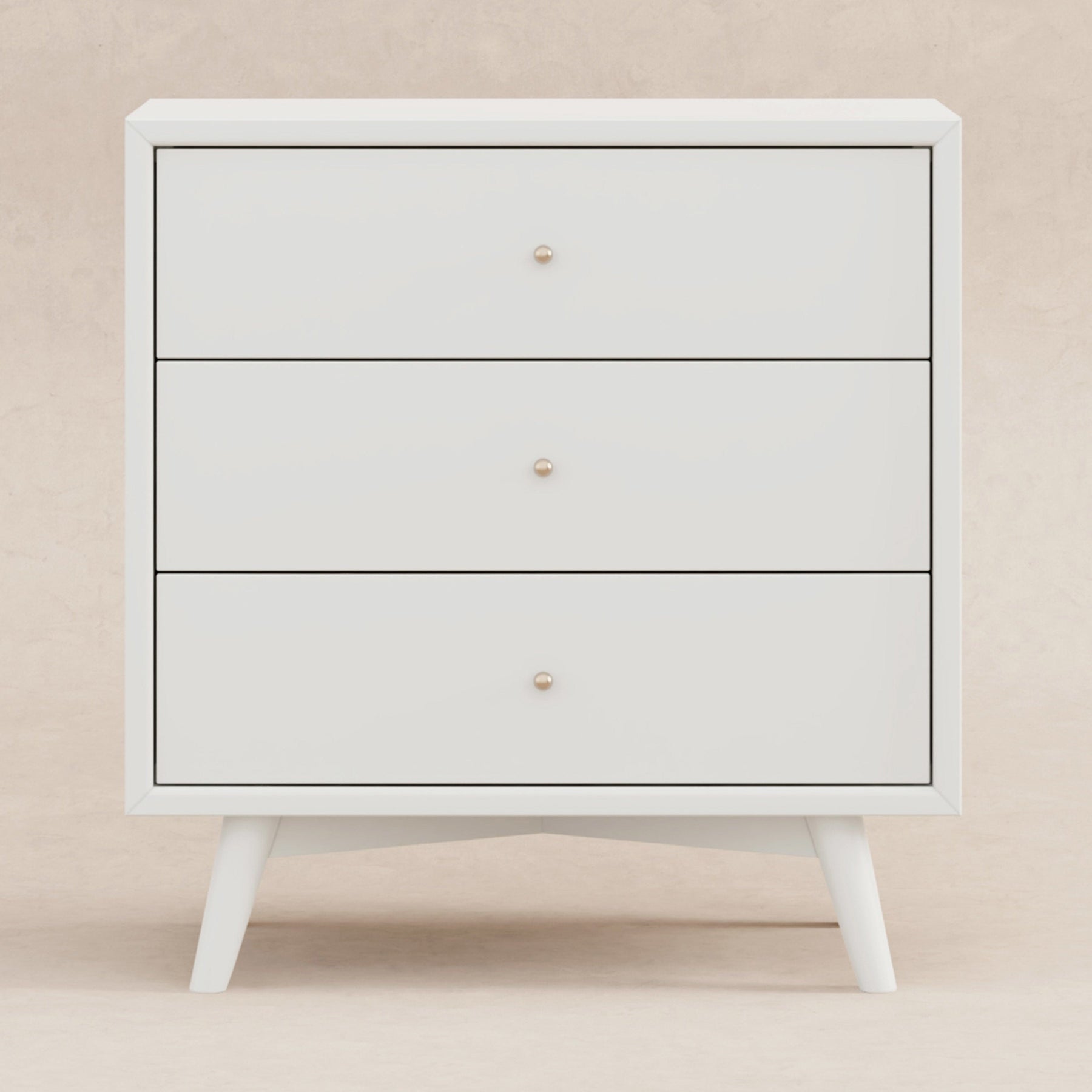 The Palma 3-Drawer Dresser is a sophisticated mid-century inspired design with tapered legs, brushed metal hardware, and smooth-glide drawers. It's a versatile modern piece, providing ample storage space that can double as a changing station. Pair with the Palma 4-in-1 Crib or Peggy 3-in-1 Crib for an elegant nursery.