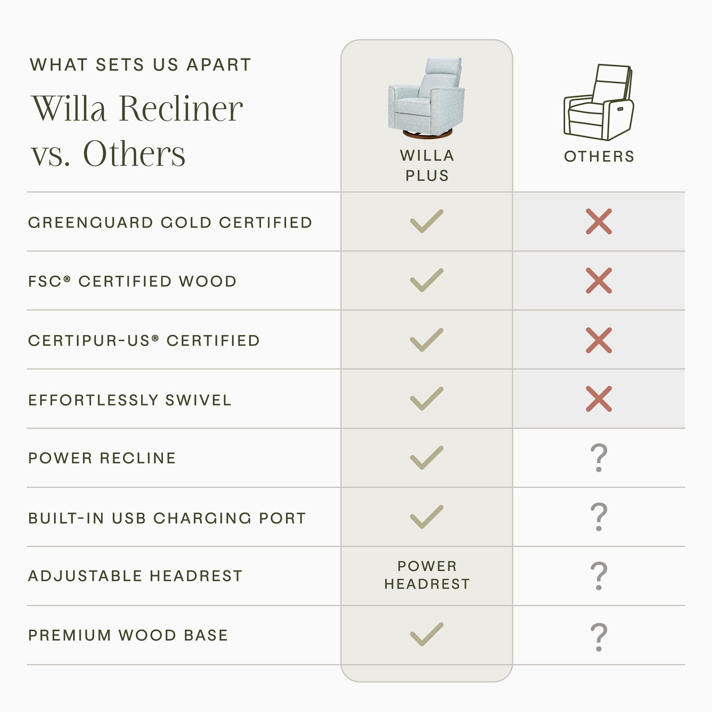 With thoughtful details and clean lines, the Willa Plus Power Glider Recliner w/ Power Headrest combines modern design with traditional comfort. Its pillow lined arms, smooth glide, and power recline + power headrest create the most comfortable and luxurious resting spot for you and your baby.
